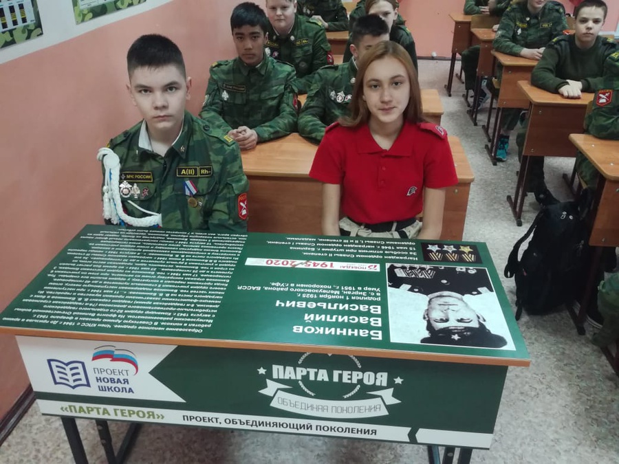 Учащиеся МОБУ СОШ №4 приняли участие в патриотическом проекте «Единая Россия» «Парта героя». Парта героя Великой Отечественной войны, Банникова Василия Васильевича, полного кавалера ордена Славы, была установлена в классе ОБЖ.