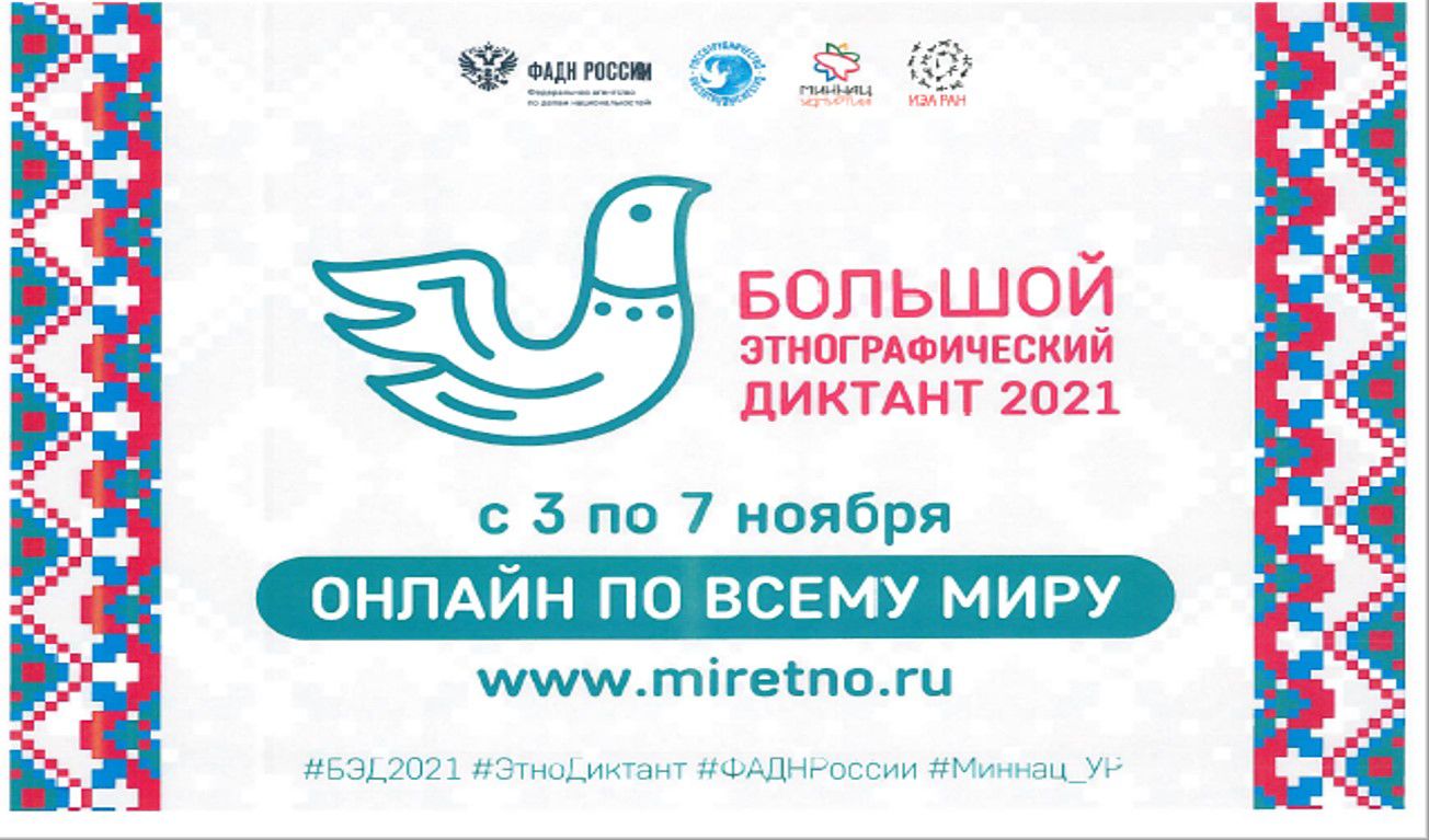 С 3 по 7 ноября 2021 года пройдет VI Международная просветительская акция «Большой этнографический диктант» в онлайн формате. Проведение акции приурочено ко Дню народного единства. В России данная акция проводится шестой год. Результаты Диктанта будут подведены ко Дню Конституции России 12 декабря 2021 года.